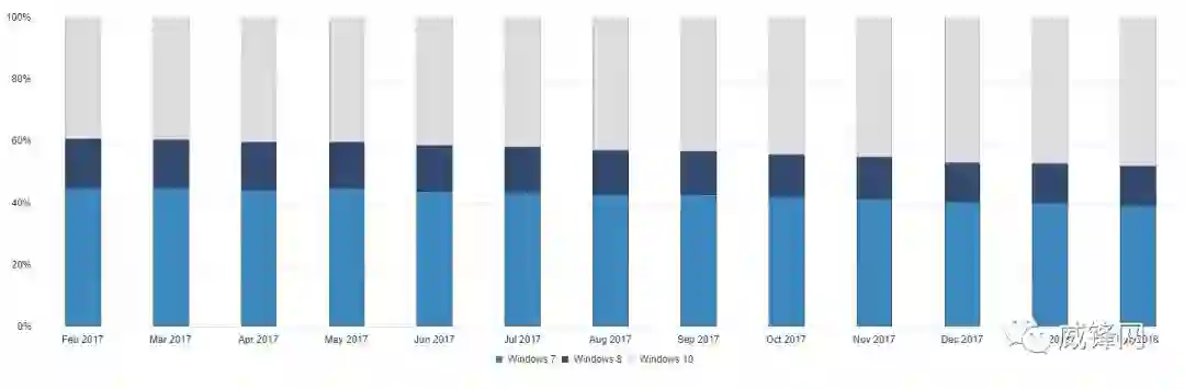 其实微软自己也提供了官方调研数据,但在 2017 年 2 月份就停止更新了。然而,一年之后的今天,微软又再一次更新了官方统计数据,其中清晰地展示了各个 Windows 版本最新的细分市场份额。
