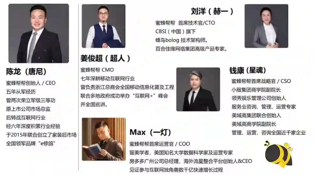 团队融合了阿里、腾讯、58等等行业经验丰富并拥有创业理念的人才,他们都把蜜蜂帮帮当做自己的事业去奋斗!