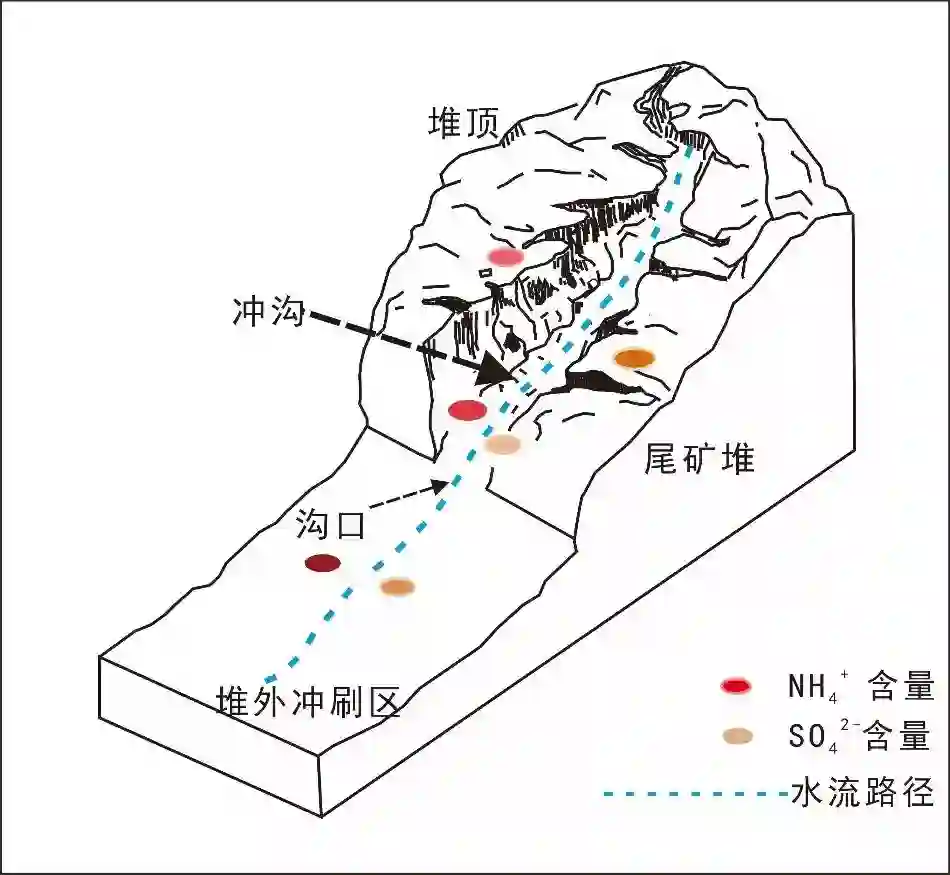 科研人员采集和处理了降雨后的径流和泥沙样品,分析了矿堆浸出物(NH4+和SO42-)沿水流路径的分布特征及迁移机制。研究发现,在矿堆不同的部位(堆顶、堆下冲沟、堆外冲刷区),NH4+ 和 SO42- 具有不同的分布特征。 NH4+ 含量由堆顶、冲沟,到堆外冲刷区依次增大,SO42- 含量则由堆顶、堆外冲刷区,到冲沟依次减少。如下图所示,在典型的降雨事件中,NH4+ 和 SO42- 具有不同的迁移机制。NH4+ 主要随径流中的泥沙移动,而 SO42- 的主要随径流迁移。溶解态 NH4+ 和 SO42- 的浓度随径流距离的增大而降低,而吸附态均未表现出明显的规律,但其浓度随着泥沙中细颗粒含量的变化而变化。