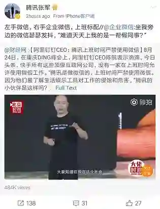 阿里钉钉CEO陈航:腾讯上班时间严禁使用微信