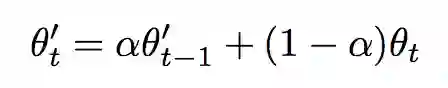 论文提出的方法是,对 Student model 每次更新的模型做移动平均,移动平均后的模型就是 Teacher model,Teacher model 也不用反向传播更新,就参数的移动平均足以。其移动平均公式如下: