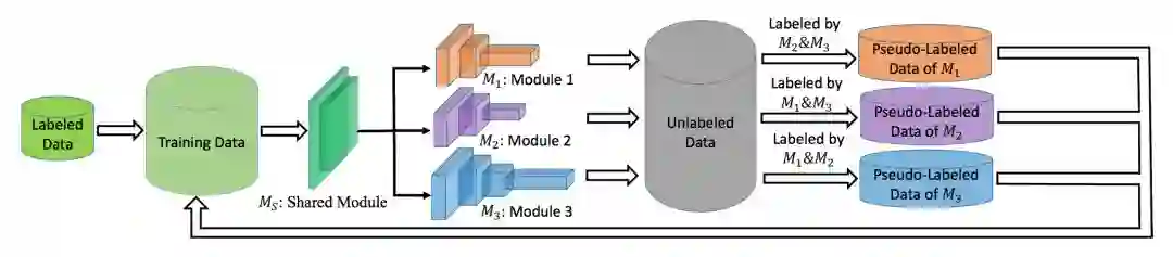 2. Tri-training 网络:如果有两个高层抽象对一个样本具有一致预测,且该预测可信且稳定,则把该样本作为加入到第三个高层抽象的训练数据中。同时,为了防止 collapsed neural networks 问题(Deep Co-Training 提到),还会在某些 epoch 中继续使用 Output Smearing 训练网络,以增加不同高层抽象的 diversity。