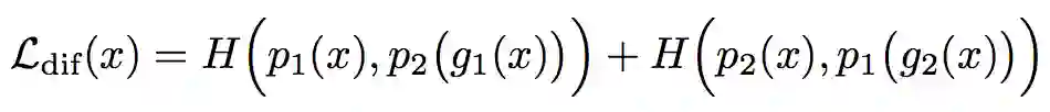 其中, g1(x) 表示网络 p1 的对抗样本, H(·) 是某种代价函数(KL 散度),该约束的设计期望是使得两个网络具备不同却互补信息。我个人觉得这是一个 very amazing 的想法。尽管我不知道理论上是否能保证两个网络不同却互补,但直观上……