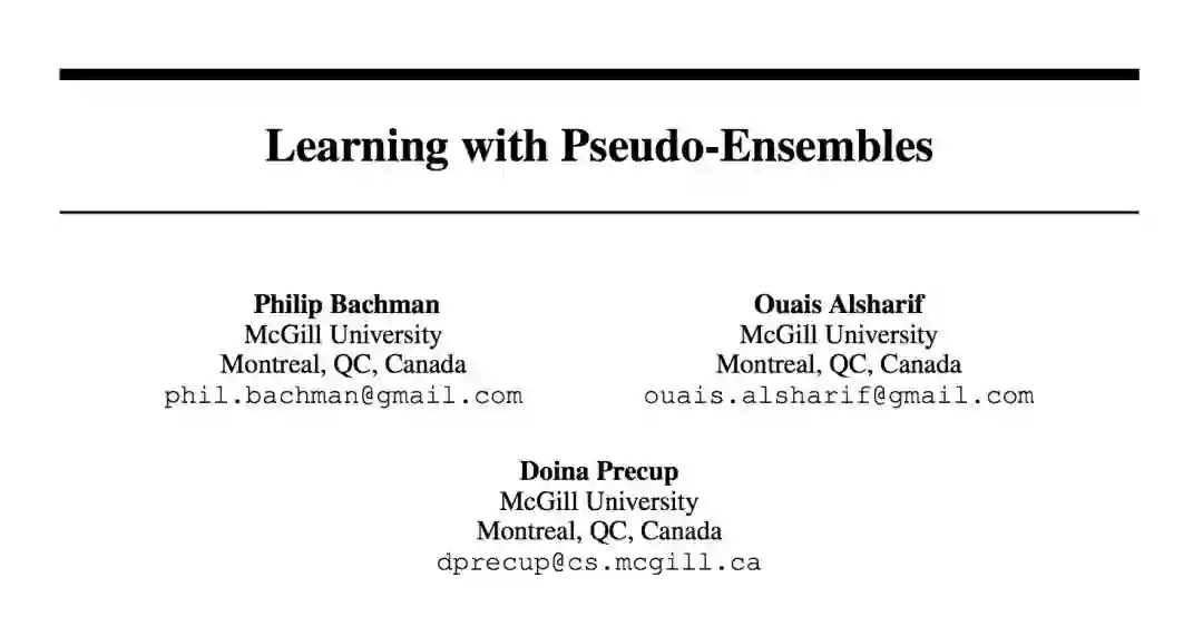 这是 NIPS 2014 年发表的工作,其提出了一个概念:pseudo-ensemble,一个 pseudo-ensemble 是一系列子模型(child model),这些子模型通过某种噪声过程(noise process)扰动父模型(parent model)得到。