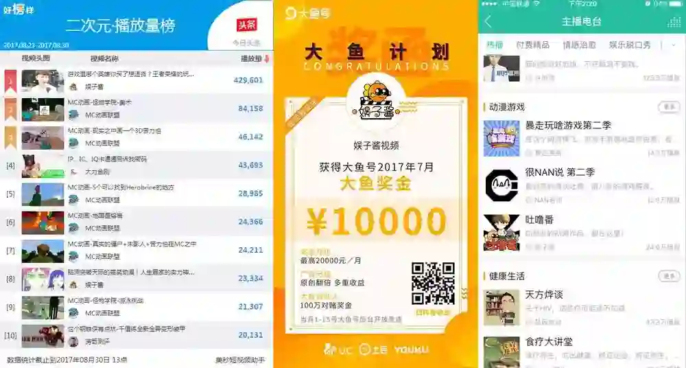 ◆在各类短视频排行榜(美秒短视频助手)和音视频平台(大鱼号、懒人听书)的重点推荐位上,娱子酱都是常客。