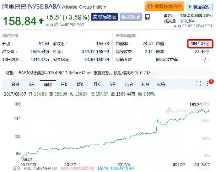 截至美股8月7日收盘,阿里巴巴报收158.84美元,市值达到了4044亿美元。这使其成为亚洲第一家市值超过4000亿美元的上市公司。