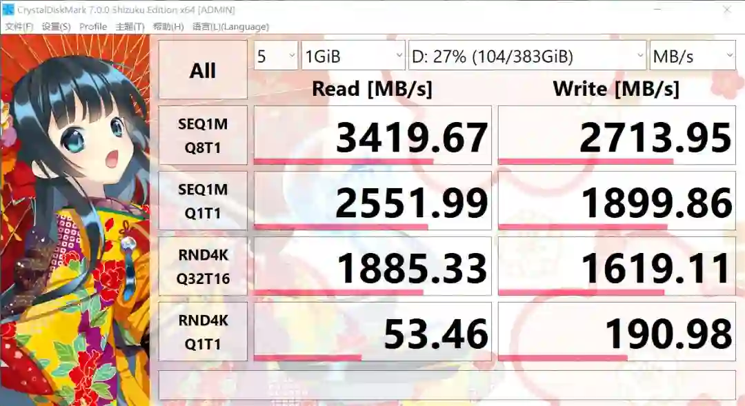 使用 CrystalDiskMark 对硬盘的读写性能进行测试,结果如下图所示。作为一块 NVMe 协议的固态硬盘,性能表现还是很不错的。