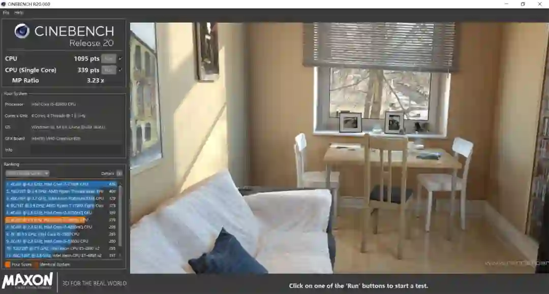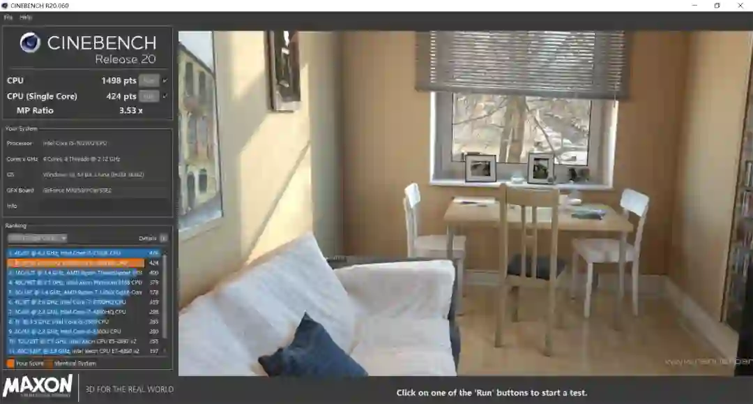 最后,使用 Cinebench R20 进行跑分。结果如下:i5-10210U 的单线程成绩为 424,多线程成绩为 1498;i5-8265U 的单线程成绩为 339,多线程成绩为 1095。