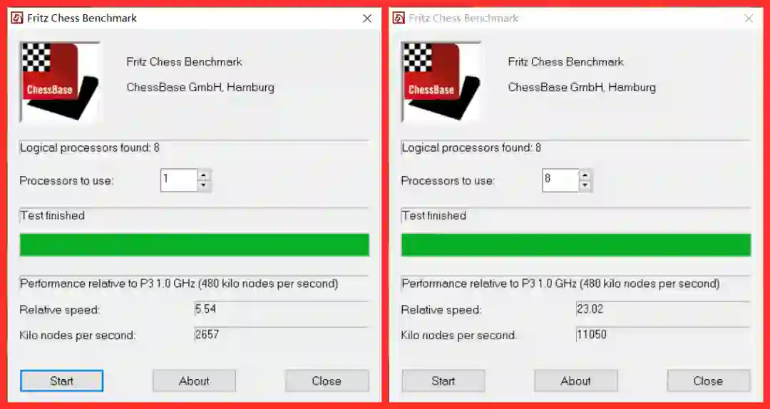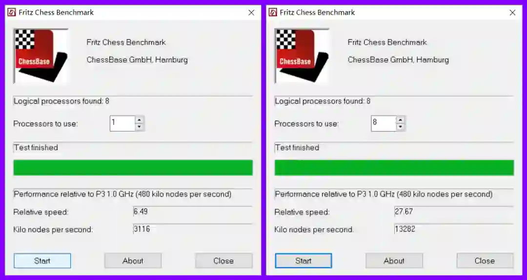首先,使用国际象棋测试,结果如下:i5-10210 U的单线程成绩为 3116,多线程成绩为13282;i5-8265U 的单线程成绩为 2657,多线程成绩为 11050。