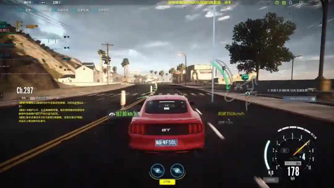 最后,玩一下经典赛车游戏的 OL 版本——极品飞车 OL,游戏画质调整为"高"。如果游戏场景是晴天,高画质下帧数维持在 58~60FPS,如果遇到雨天场景,帧数会下降到50~55FPS。而在"最高"画质,帧数会降低到 40FPS 以下,游戏流畅度会受影响。