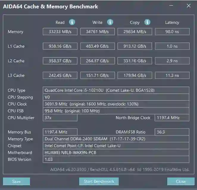 稍显遗憾的是,仅有 i5 版本可以选择 16GB 内存,i7 版本则只有 8GB 内存可选。使用AIDA64 内存测试,读取速度为 33233MB/s,写入速度为 34761MB/s,延时 98.0ns。读写速度均突破 30000MB/s,双通道内存优势明显。