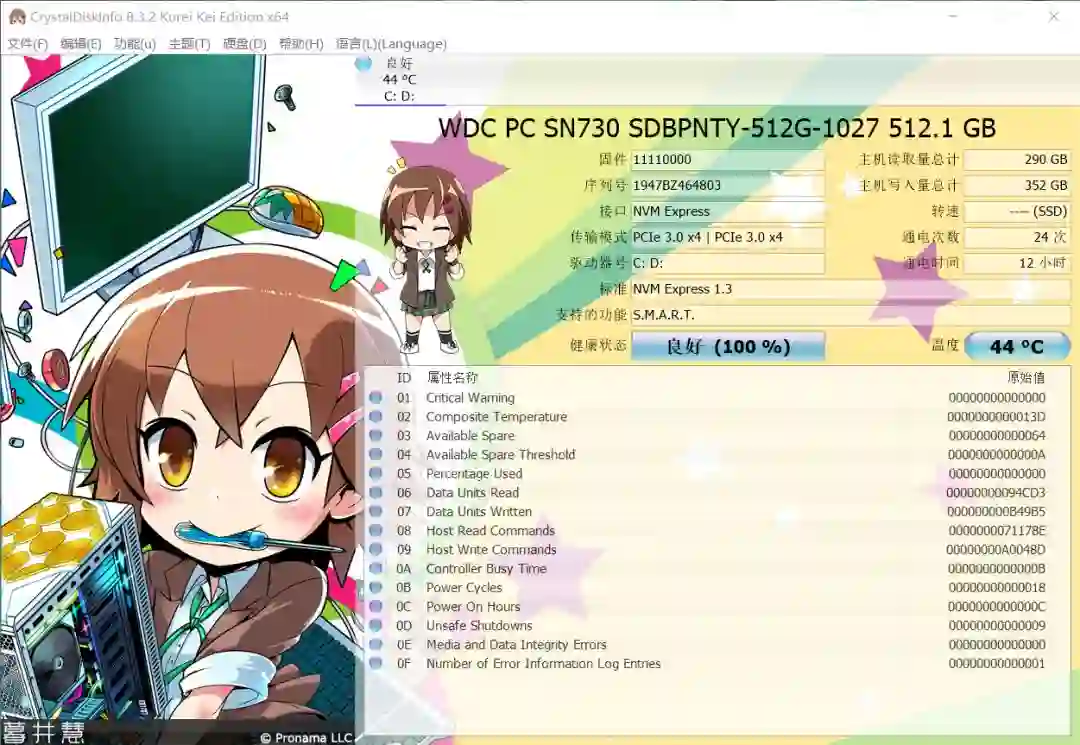荣耀笔记本 14 搭载了一块 512GB 的固态硬盘,通过 CrystalDiskInfo 查得其型号为 WDC PC SN730,是一块来自于西部数据的固态硬盘。
