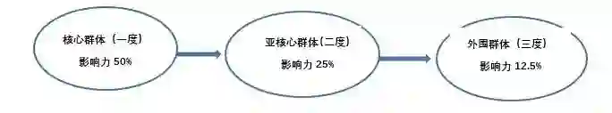 还有一个基础性问题需要解决,即把一个人所认识的群体根据偏好、亲疏远近做划分是否有道理呢?哈佛大学的社会学教授尼古拉斯·克里斯塔基斯提出的“三度影响力”原则可以支持我们对群体结构的划分。按照尼古拉斯的说法:我们所做或所说的任何事情,都会在网络上泛起涟漪,影响我们的朋友(一度)、我们朋友的朋友(二度),甚至我们朋友的朋友的朋友(三度)。如果超出三度分隔,我们的影响就逐渐消失。尼古拉斯的“三度”分别对应我们的核心群体、亚核心群体与外围群体。但是对于网络传递过程中的影响力衰减模式,尼古拉斯并没有给出具体的说明。联系到前期的一些观察,我们给出影响力逐级衰减的比例是减半规则。为了形象地说明这个问题,下面给出个体在群体中影响力衰减的示意图: