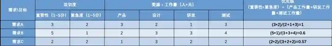 从上表优先级结果可以看到,【需求A】的优先级为1.00、【需求B】的优先级为0.60、【需求C】的优先级为0.57,所以三个需求在开发时的优先级依次为【需求A】>【需求B】>【需求C】。