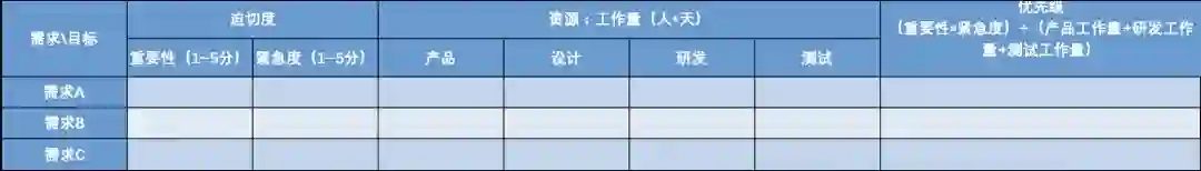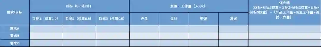 到此,优先级评估分析的基本模型已经确立,接下来需要找到能够影响上述目标打分和工作量评估的角色来填充表格内容了。