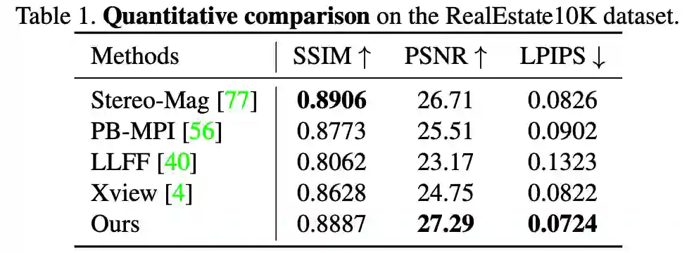 研究者对比了不同方法在 RealEstate10K 数据集上的量化对比结果,如下表 1 所示: