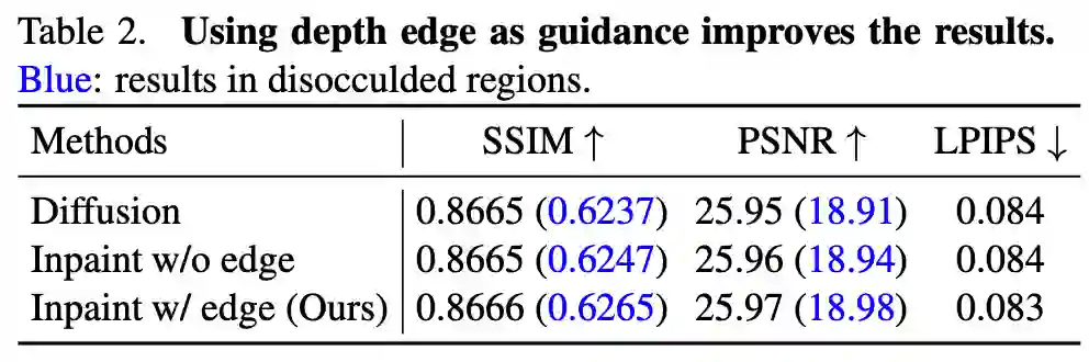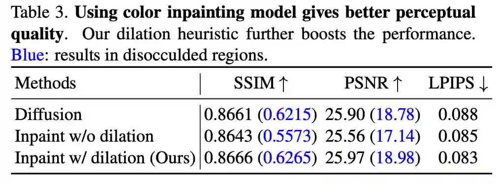 此外,由于检测到的深度边缘可能无法与遮挡区域的边界很好地对齐,因此研究者将合成区域扩大了 5 个像素,这有助于减少修补区域中的伪影。