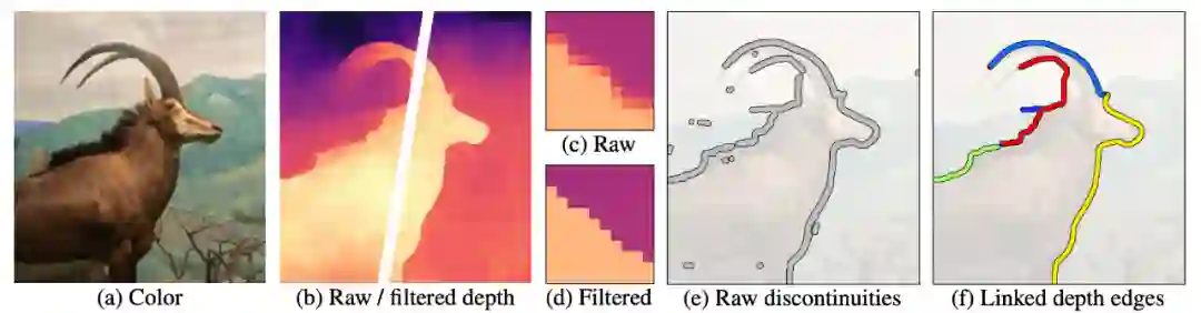 下图 2 展示了图像预处理的过程。首先对颜色和深度输入进行预处理 (a-b),然后使用双边中值滤波器锐化输入深度图 (c-d),接下来使用视差阈值检测不连续区域 (e),清除错误的阈值响应并将不连续区域组合成为连接深度图 (f)。这些连接深度图正是修复过程的基础。