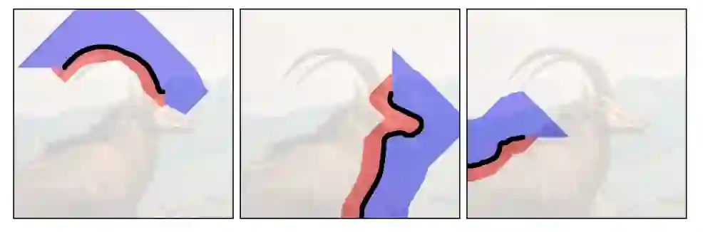 图 4:语境/合成区域。图 2(f) 中三个连接深度边缘示例(黑色)的语境区域(蓝色)和合成区域(红色)。