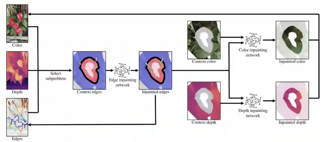 给定颜色、深度、提取以及连接的深度边缘作为输入,随机选择其中一个边作为子问题。首先使用边缘修复网络修复合成区域中(红色区域)的深度边缘,然后将修复后的深度边缘与语境颜色连接在一起,并应用颜色修复网络生成用以修复的颜色。类似地,将修复后的深度边缘与语境深度连接起来,并应用深度修复网络生成修复深度。
