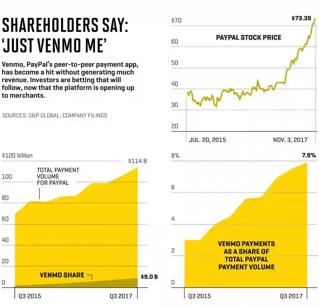 贝宝股价和收入,以及Venmo在贝宝业务中的比重 | 图片来源:Nic Rapp