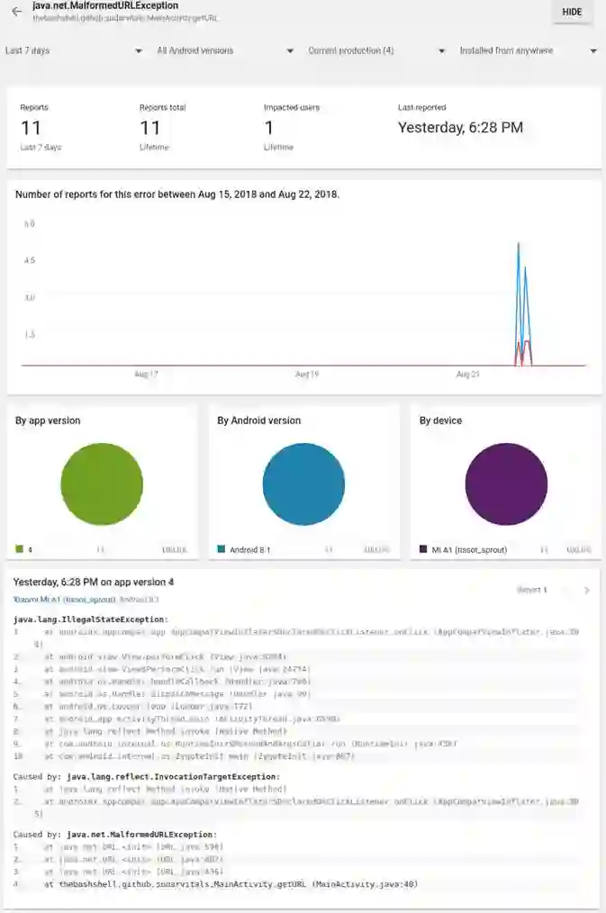 选择相关的崩溃群集即可深入研究被报告出的崩溃现象。这里会有详细视图显示出来供您查看。在这个页面中,您可以查看发生的异常类型、报告数量以及每次崩溃的受影响用户。您还可以获得应用版本、Android 版本以及发生崩溃的设备列表的统计信息。一个很棒的功能是,您可以查看有关设备类型的一些基本信息 (例如 RAM),从而对崩溃原因有更深入的了解。
