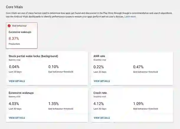 Overview 页面在顶部显示核心 vitals 指标 (崩溃、过度唤醒、ANR、部分唤醒锁定阻塞)。我们发现,这些指标对应用性能表现较为重要。 Overview 页面上提供了有关所有指标的信息,并提供了过滤功能。您可以通过单击 View Details 深入了解任意指标。