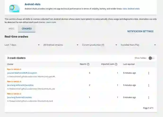 应用崩溃和 ANR 在 Android vitals 菜单下有一个专门的分区。要查看实时崩溃信息,请在 ANRs & Crashes 下选择 CRASHES。应用崩溃以群集形式显示,其中显示了报告和受影响用户的数量。您还可以根据 Android 版本、时间段、应用版本和应用安装源过滤数据。