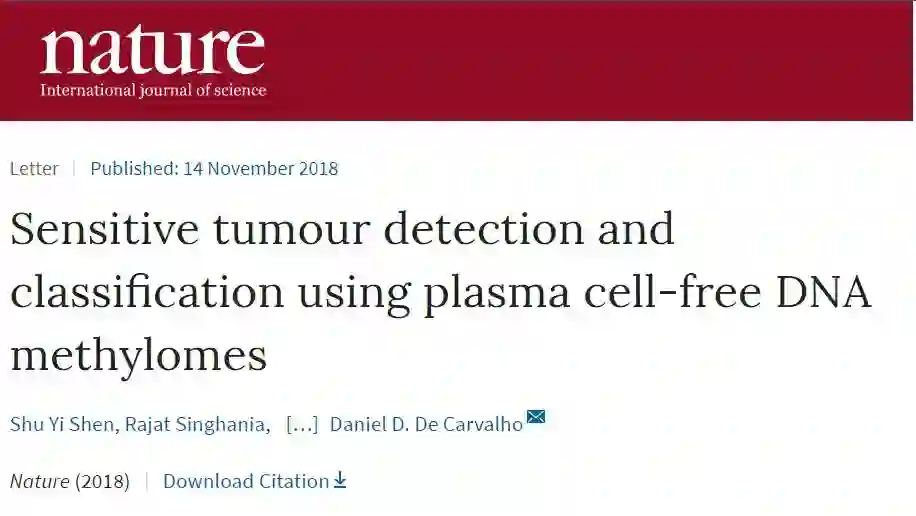 2018年11月15日,国际顶级学术期刊Nature发表了一项液体活检最新重磅研究成果。来自加拿大玛格丽特公主癌症中心及多伦多大学的研究团队开发了一种基于免疫共沉淀的新型高通量cfDNA甲基化测序技术,名为甲基化cfDNA免疫共沉淀测序(cfMeDIP-seq)。该技术仅需几纳克DNA就能高灵敏度地检测cfDNA的甲基化特征,帮助研究人员早期发现癌症,还能鉴别不同癌症类型特有的DNA甲基化特征。
