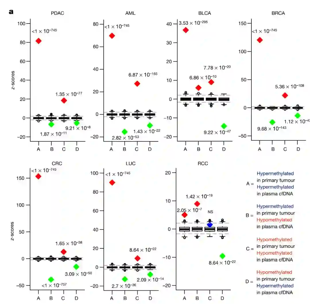 此外,研究人员分析发现,cfMeDIP-seq可以通过检测DNA甲基化特征,从健康对照中区分24名早期胰腺癌患者。通过检测来自7种不同肿瘤类型(急性髓性白血病,胰腺癌,结肠直肠癌,乳腺癌,肺癌,肾癌和膀胱癌)的388个样本,该检测方法还可以通过识别特定的甲基化特征区分癌症类型。