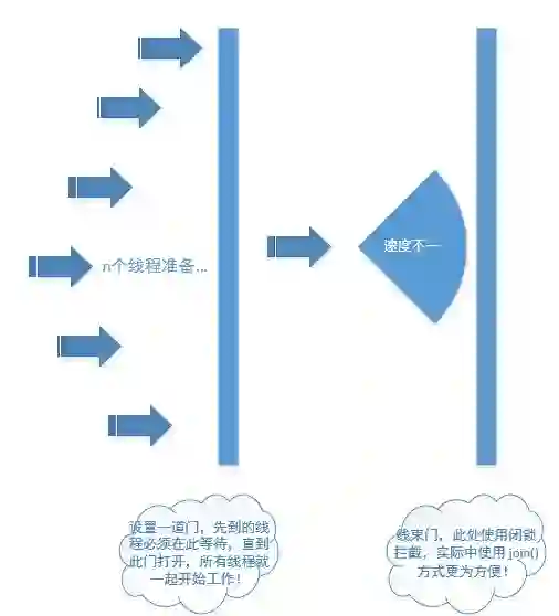 与 CountDownLatch 有类似功能的,还有个工具栅栏 CyclicBarrier, 也是提供一个等待所有线程到达某一点后,再一起开始某个动作,效果一致,不过栅栏的目的确实比较纯粹,就是等待所有线程到达,而前面说的闭锁 CountDownLatch 虽然实现的也是所有线程到达后再开始,但是他的触发点其实是最后那一个开关,所以侧重点是不一样的。