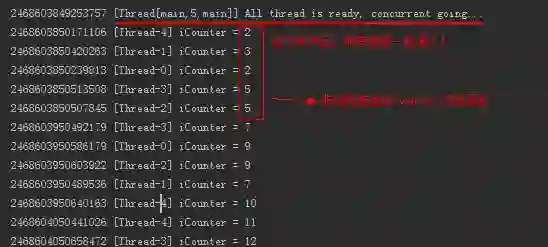 此处设置了一道门,以保证所有线程可以同时生效。但是,此处的同时启动,也只是语言层面的东西,也并非绝对的同时并发。具体的调用还要依赖于CPU个数,线程数及操作系统的线程调度功能等,不过咱们也无需纠结于这些了,重点在于理解原理!