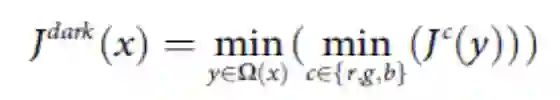 利用暗通道的概念发现了单个模糊图像的传输,暗通道假设所有室外图像中至少有一个颜色通道存在为零或极低的像素。对于无雾图像 J,暗通道是: