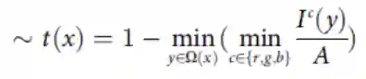 其中 Ic(y)/A 是由 airlight A 归一化的模糊图像,右边第二项是归一化模糊图像的暗通道。