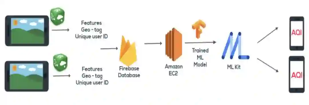 我们开发的应用程序从手机相机收集图像,然后在设备上利用 Tensorflow Lite 处理图像,得到 AQI 估计。在开发应用程序之前,我们在云上训练了 AQI 评估模型。在 Android 应用程序中,使用 Firebase ML Kit 能自动下载该模型。