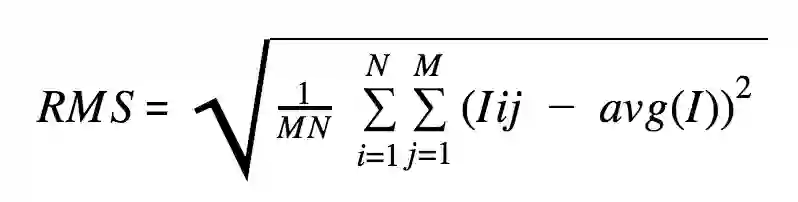 熵,RMS 对比度:这些特征告诉我们图像中包含的细节。如果有空气污染,图像会丢失细节。RMS 对比度被定义为图像像素强度的标准差。RMS 对比度的等式如下: