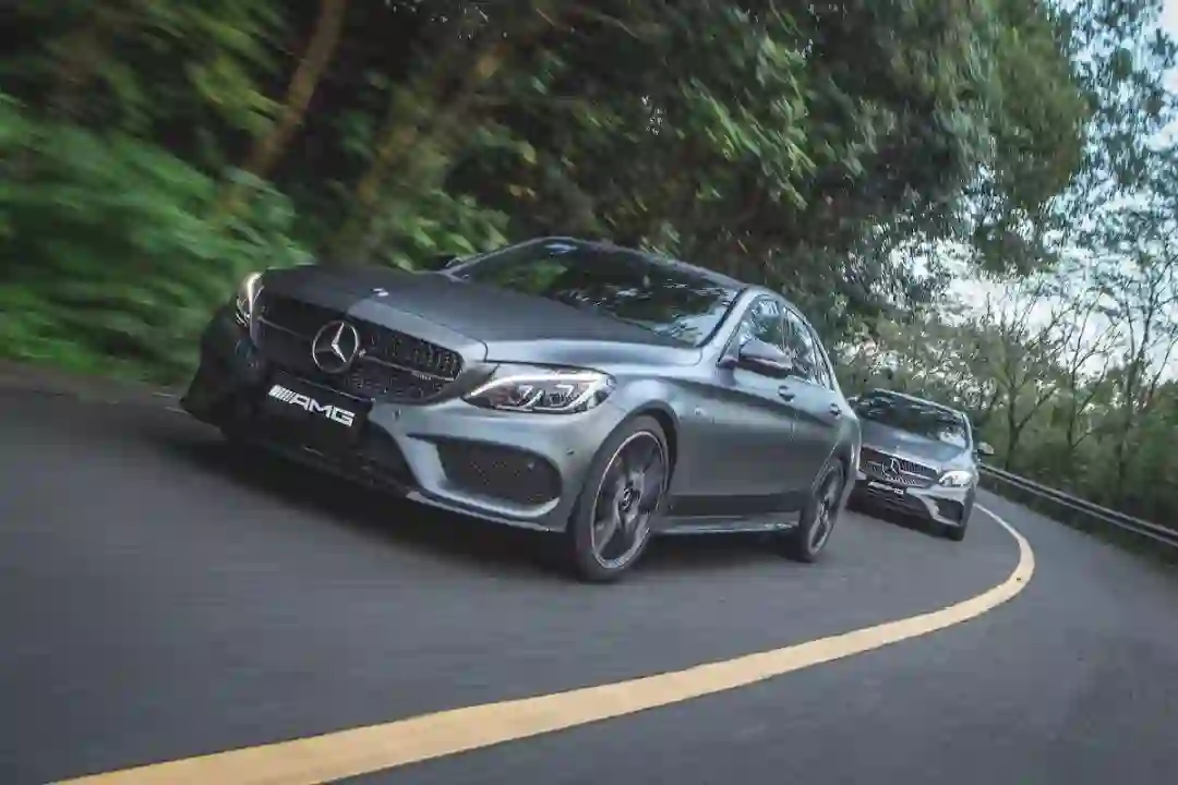 在山顶体验完刺激的攻防箭运动后,接下来与 AMG C 43 4MATIC 特别版的相处亦是我期待已久的。它的外观非常低调,但开起来却是一台不折不扣的 AMG。在动力方面,它同样搭载了 3.0T 双涡轮增压发动机,9 速自动变速箱在经 AMG 调校后大幅提升了在平顺性、换挡逻辑等方面的表现,同时还获得了媲美双离合变速箱的换挡速度。在运动模式下深踩油门,它就会立刻连降三挡,给你带来非常直接的换挡冲击感,这绝对会让性能控们欲罢不能。