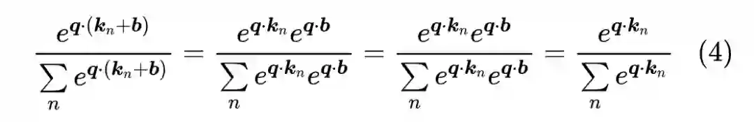 ,事实上,“可以去掉 Key 的 Bias”这个结论,是针对没有 RoPE 的 Attention 的,由于 Softmax 的存在,加上的 bias 可以约掉: