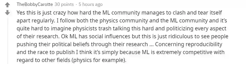 还有网友提到了其他社区,如物理社区,称这类社区或许不像机器学习社区那样充斥着攻讦和分裂。他表示,机器学习固然存在着广泛的社会影响,但人们将他们的政治理念强加在自身的研究上是多么的荒谬。