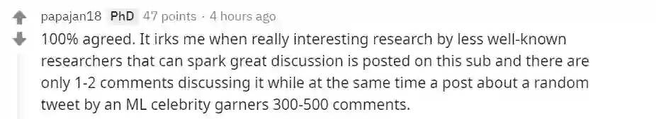网友表示,一些不知名学者的有趣研究虽能引起注意,但评论的人却少之又少;与之相比,机器学习名人的一篇推特却能有数百条评论。这种现象恐怕不利于新研究或技术的推广和持续发展。