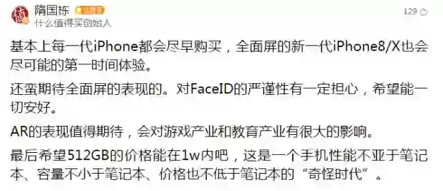 基本上每一代iPhone都会尽早购买,全面屏的新一代iPhone8/X也会尽可能的第一时间体验。还蛮期待全面屏的表现的。对FaceID的严谨性有一定担心,希望能一切安好。AR的表现值得期待,会对游戏产业和教育产业有很大的影响。