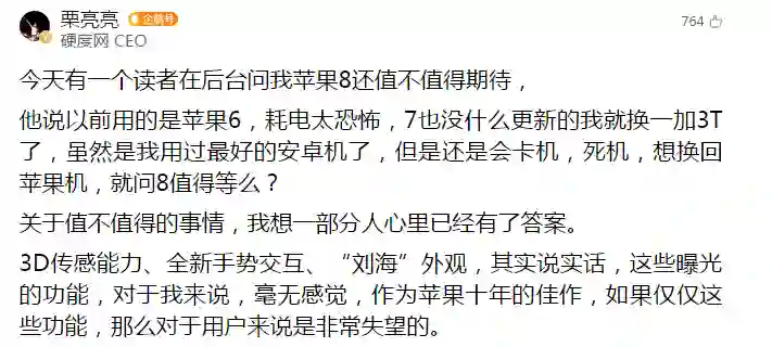 在没有太大的创新点的基础上,iPhone8的价格是一个很关键的因素,如果没有太大的创新,价格还卖7.8千,那么我真的要跟iPhone说再见了,从iPhone5起,iPhone就没有什么大的创新了。
