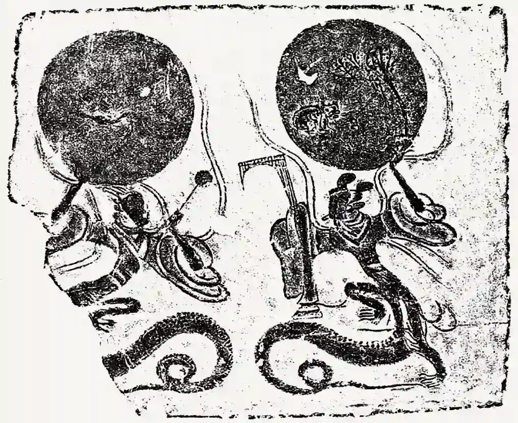 规矩都有了,女娲边上往往还有个月亮,月亮里有只蟾蜍,就是嫦娥险些变成的那个蟾蜍,人们说女娲的“娲”就是“蛙”的意思。