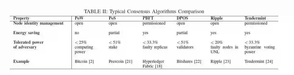 为了实现去中心化,区块链设计成了分布式的架构,并且没有任何的中心节点。每一个节点都会维护着自己的一份账本,但是没有中心节点的维护,每个节点之间的可信程度又是不确定的,如何确保每个节点维护的账本是一致的。这个问题起源于拜占庭将军问题 [7]: 多个将军包围了敌军,但是需要全部将军一起进攻,才能胜利,需要将军们对于这个问题达成一致,但是将军们里面可能出现叛徒。 在区块链中,已经有着很多的共识算法,我们对于目前的常用一些共识算法进行了整理并且进行了比较,如表二。 限于篇幅,这里只介绍Proof of Work 和 Proof of Stake。