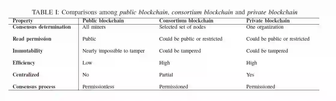 目前通常来说,将区块链分成三类,公有链,私有链,联盟链。对于公有链而言,任意节点都可以参与到这个公有链的共识过程,并且由于节点是分布在各处,几乎不可能对于区块链进行篡改。但是同样的,由于节点过多,公有链的处理效率并不高。私有链和联盟链则避免了这个问题,私有链和联盟链最大的区别在于,私有链是由一家机构控制的,而联盟链可以是多家机构组织控制的,但是他们对于成员的加入是由严格管理的。具体的比较如表1 所示。
