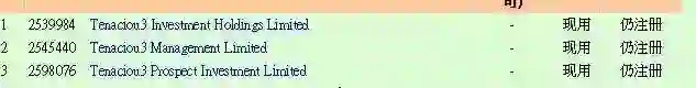 与这家成立仅4个月的公司前后时间段注册的,还包括注册于2017年5月29日的Tenaciou3 Investment Holdings Limited,注册于2017年6月15日的Tenaciou3 Management Limited。