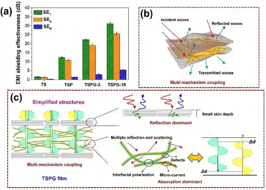 图2 (a)复合薄膜电磁屏蔽性能分析。(b-c)复合薄膜电磁屏蔽机理分析。