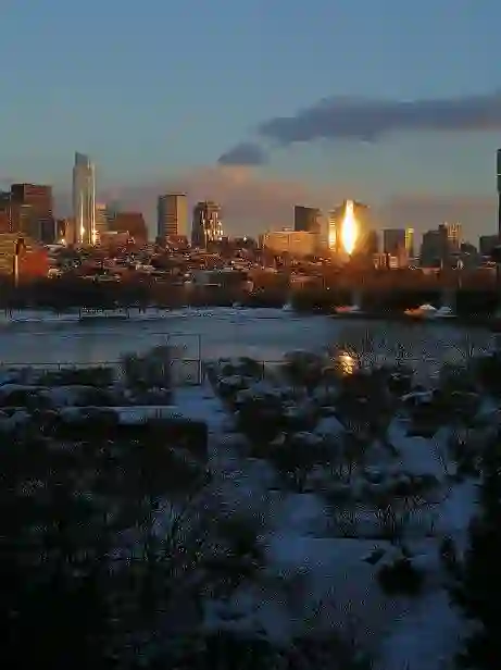 波士顿Charles River的雪中夕阳。会议当周,波士顿还是冰天雪地(供图:文小刚)