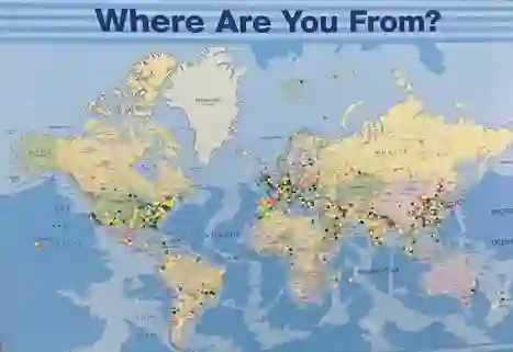 三月会议虽说名义上是美国物理学会举办的国内会议,但参会者来自世界上各个国家,是名副其实的国际凝聚态和材料物理大会。如3月初在波士顿举办的2019年度三月会议,共有一万两千多名代表参会,其中30%来自美国以外的地区,主办方在大门口放了一面巨大的世界地图,让参会者用小圆贴纸在地图上标出自己的所在地,结果如下图所示,各种颜色的小圆点覆盖了整个地图。会场内外可以听到各种语言,英语毫无疑问是三月会议的第一大语言,而随着中国的科研实力迅速增强,参会的华人学者越来越多,中文也日渐成为三月会议的第二大语言。