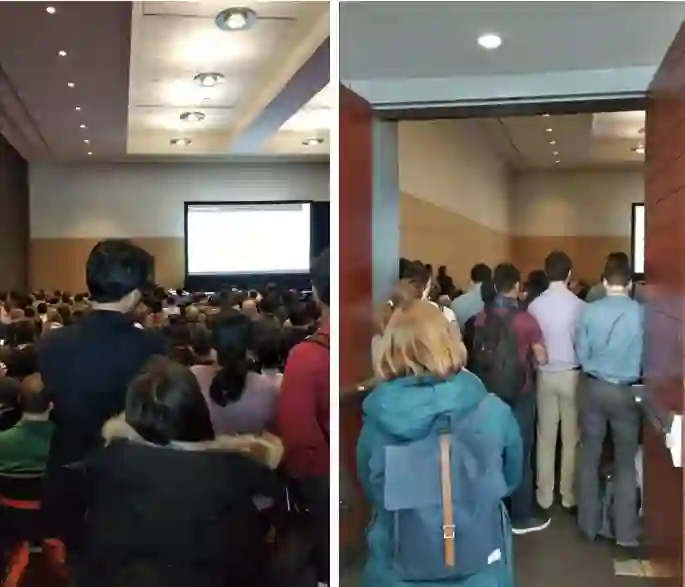 由于参会人数巨多,统计分布上每个session room差不多要能装下150人左右才行,这也是会议主办方规划会议时的愿景。但是,既然是统计问题就难免涨落,三月会议上总有些特别火的session,人多得会议室都挤不进去,后排一直站着挤到门口,前面的过道里大家席地而坐,其乐融融。在我的记忆里,前几年拓扑绝缘体、拓扑半金属以及二维材料的许多session都是这样,印象中有好几个session,我都是坐在地上听完的。今年的三月会议上,最火的话题无疑是转角石墨烯,这种令人脑洞大开的对二维材料的调制方式,迄今为止已经取得了巨大的、完全出乎意料的成功。在这种单纯由碳原子组成的二维网络上,目前已经成功实现了超导、铁磁、反常霍尔效应、准晶等等不同的奇异物态,堪称二维材料版的“The Universe in a Helium droplet"。因此,在这次波士顿会议上,有关转角石墨烯的session总是一座难求,笔者周一/周二连续两天都是早上7:30赶到会场,才有座位。